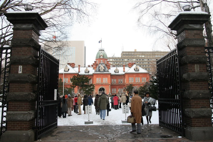 隨意走走,繞舊北海道廳外圍一圈,多照了一些03年沒照到的地方,這四周也盡是積雪,很有美感。然後有看到北海道新幹線的標語,看來新幹線是多麼受期待。08:40進去參觀,03年也有進來,有些還有印象,比如說明明治初期只有22萬人,一百多年後到六百多萬。我這次看到了一個怪事,便是在擺放文字、書籍的玻璃櫃內,竟擺著一杯杯的清水,這樣不怕文物受水氣影響而遭破壞嗎?