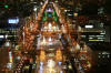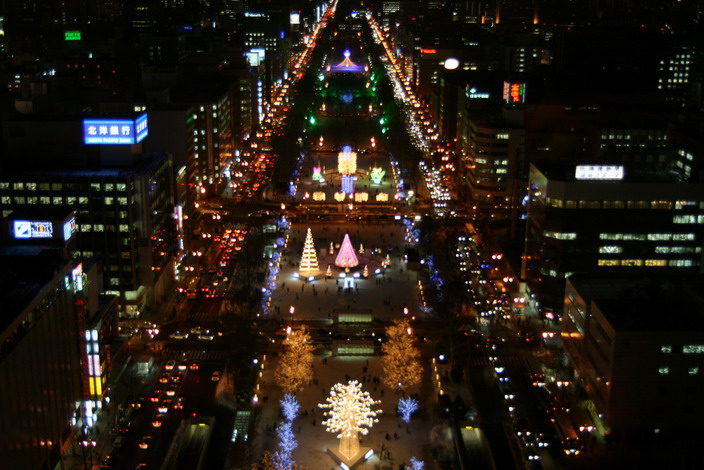 到大通後,直接找電視塔,03年沒上去,這次無論如何也要上去看看的。找到後,發現它似乎是大通公園的頭,以它往前延伸。 先買票上去看夜景,其高147公尺,票價700日圓。在夜晚的此時也只有大通公園這個方向,因有許多為了聖誕節的裝飾或者札幌雪祭的需要,有不少燈飾使得夜景可看,其他方向在一片漆黑中,就沒甚麼可說的了。也正因此所有的人潮都聚集在此,要想找個照相的空位都很難。但又因只有此處有美麗的夜景,所以也只好等待有人退出,找到空位再照。不過其實還有個麻煩就是,室內的燈光或雜物的反影會映在前方玻璃上,導致仔細看相片的話都能看到。於是盡量調照相的方位和角度去避免反影就得耗些時間或精神。真的很希望像這樣的情況在任何室內提供照相景點的負責人能注意此事,讓遊客們能有個滿意的照相環境。大通公園這個方向看來對反影處理較好,所以比較能找到不受反影干擾的照相點,也因此我照了很多張,在白雪當背景的襯托下,使燈光飾物映照於白雪的夜景,增添不少美麗的成分。