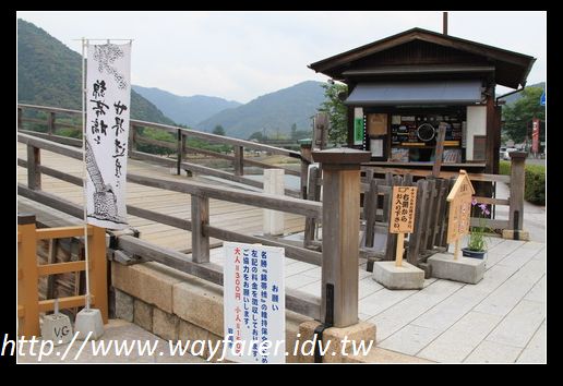 記了一下開車時間,以及路上的指標,發現公車還真會繞,若是有機會自行開車,我想應該不到十分鐘可到,而公車卻花了20分鐘。下車後先去看回程時間,班次還滿頻繁的,約一、二十分就一班,所以無須記憶。接著到寄物櫃寄放行李,只帶了小背包和三腳架才開始逛。到了橋頭竟發現走橋要錢,不過有套票組,覺得不錯就買了,930日圓覺得合理。反正我本也打算要搭纜車上去岩國城一遊。先在橋頭照照相才走上橋去。這錦帶橋只剩木頭原色,不知道以前是否就是如此樸素。在橋上也繼續照相、看風景。雖說今天不是假日,但遊客還是挺多的,一波波的遊客時時湧來。過橋後往佐佐木小次郎的指標去走,不過途中轉進了江邊公園,因為似乎有好的位置可以照錦帶橋的美景。來到江邊果然是個好位置,往來的遊客又少,於是架起三腳架,放心自拍,留下與景點的合照。錦帶橋與水面相輝映的景觀,呈現出靜態的美景,也讓我感到到此一遊是一個很值得的選擇,很自在地照了很多張。