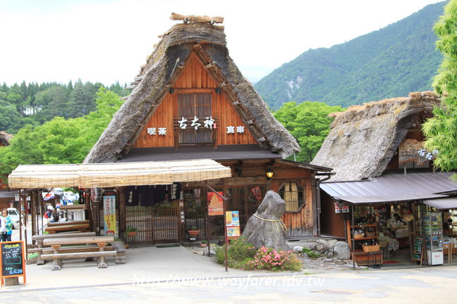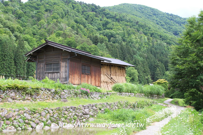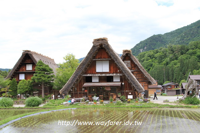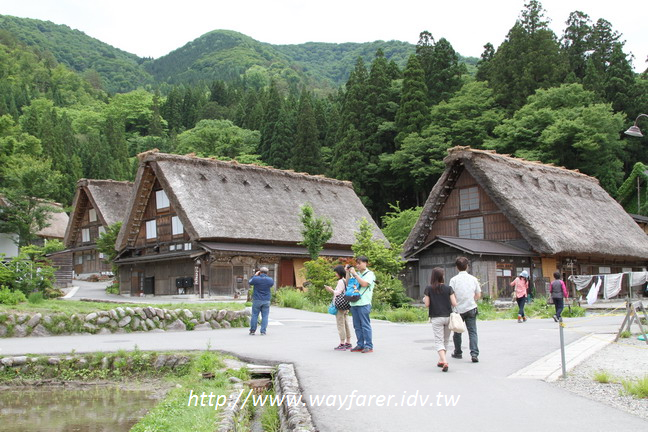 本想好好照照であい橋,可是人太多,走來走去,很難照到乾淨的橋景。才107公尺很快便走完,也看到有過合照的であい橋名碑,而從這以後便是合掌屋的精華了,也是可以開始自由逛的時間,想花多久時間就看個人了。不過如果是團體客那就可能會受限,而我則是時間較多可以隨便走隨便看。先往東通路方向走,剛開始就有不少合掌屋的房子以及稻田,風景已很優美,令人不由得駐足觀賞,也多照了一些照片,感覺看多久、待多久都不膩,一整個美景啊。只是還是得繼續看看其他地方,不得不往前進。經過長瀨和神田家著名的合掌屋處,入內要300日圓,就不進去了,只是在外面照照外觀,看看就好。