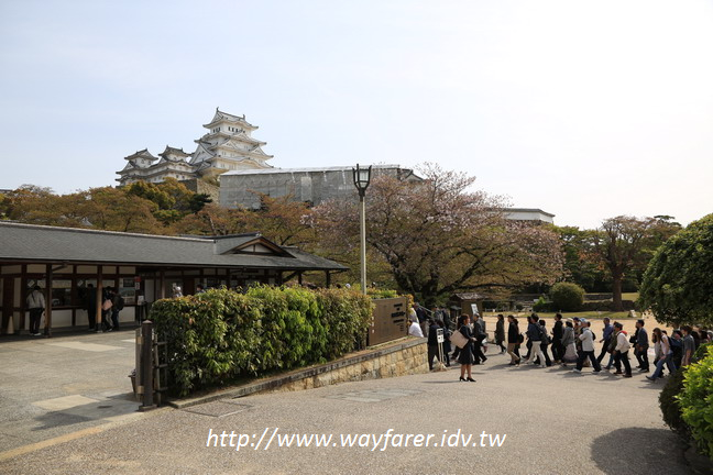 往姬路城的路上,走在感覺還有熟悉的街道,這是我第三次來姬路城,不過這次感覺路變遠了,心理因素吧,以為會很快到卻不是。仍然經過みゆき通後轉往大手門進,此時已可見到很多遊客往姬路城而來。當然在行進中,我視線已離不開姬路城了,因為不管在甚麼角度與位置,別稱白鷺鷥城的姬路城都很美,可惜仍有部分工事在進行破壞了少許的美感。按著記憶從花園經過,這裡也可照到不同角度的姬路城,不過一直被工事圍籬部分,怎麼看就是不完美,很可惜。