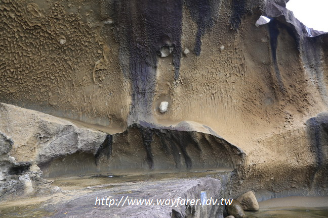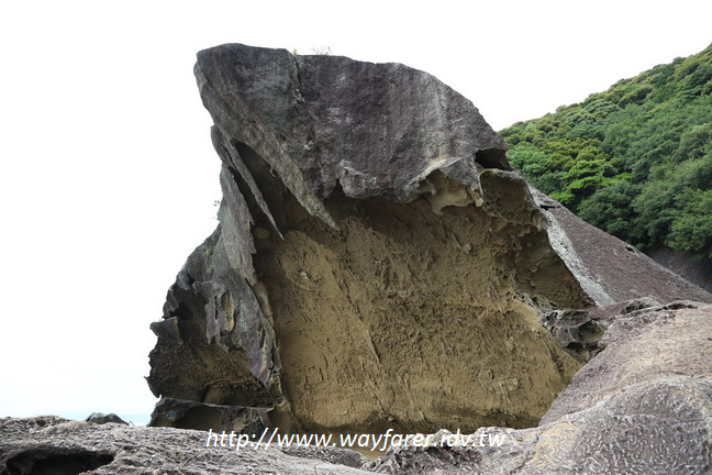 接下來的步道也是行走於岩壁旁,這應該屬於人工,但卻可看出原本就是因風化造成一些空間,才有開闢成岩壁路的機會。行走其間步步驚嘆,眼睛幾乎沒片刻空閒,必須時時注意著四周的景觀,沒有可忽略的風景,只怕沒把所有的景觀都深印在腦海裡。走這一段,速度非常慢,不是因為驚險,也不是因為難走,而是因為景色太美,每一處都捨不得離開之故。每隔小小一段都有特別的景,也有其特別命名,滿有創意的,增添了鬼城的豐富內涵。非常佩服以及感謝日本人能將這一大塊連綿甚長的岩壁利用天然與人工的結合,創造出如此令人驚嘆的步道景觀,讓遊客可以身於其中來欣賞。我相信光是照片就足夠讓大家讚嘆不已,更河況身歷其間的我。絕對值得一遊的鬼城周遊步道。