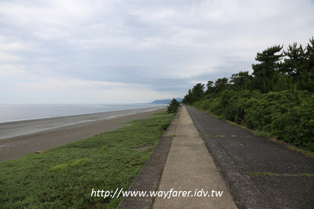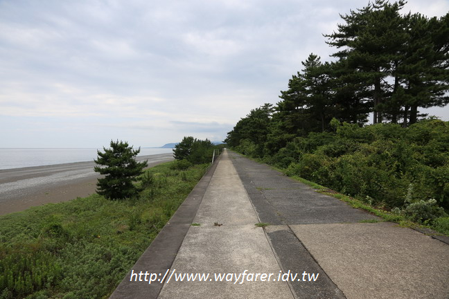 看到海濱處有堤防,想說先去走那裏看看海景會比較好,於是切往海濱,這一切,被海堤步道與海景振奮了精神與心情,這才對嘛,七里御濱,本該就是走海濱步道的,而事實上也是對的,後來發現熊野古道的介紹也是要走這樣的海濱步道。日本的里是3.9公里,也就是將近有28公里的海濱步道。根據調查北段從JR熊野市駅〜JR阿田和駅,12.2公里;南段從JR阿田和駅〜JR新宮駅,14.4公里,合起來是26.6公里,很接近了。只是當時以為七里御濱只是古代熊野古道的稱呼,不一定是這麼靠近海邊來走,因此一度以為是走在國道42的行人步道,尤其花窟神社被標示為七里御濱必遊的景點,也難怪會誤認。實際走過之後,也從零星的標示,可以確認七里御濱的確是要走在海濱步道的,也就是如今可見的海堤步道。