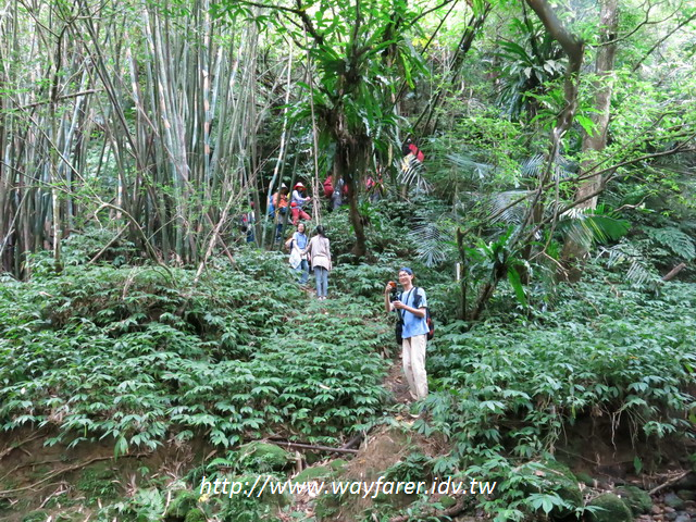 11:11 追上大家了。這之間其實一直討論著路上很密集的山蘇,寄生在樹上,眼前就有幾叢。因為不明白為何會種植這麼多(不像是野生的,因為太大一片了),所以特別GOOGLE了一下,原來是:"原住民經常採取山蘇花剛生長出的嫩芽煮食,味道脆嫩可口,目前已成為山產店的招牌佳餚之一。",或許當時就是為了當做菜餚吧。另外也說明了山蘇的生長環境與所見相合:"山蘇花在中低海拔山區森林裡,是經常可見的植物,只要在溼潤的林間,很容易發現現它高踞樹枝,在山林野外活動時山蘇是令人垂涎的野味。"。