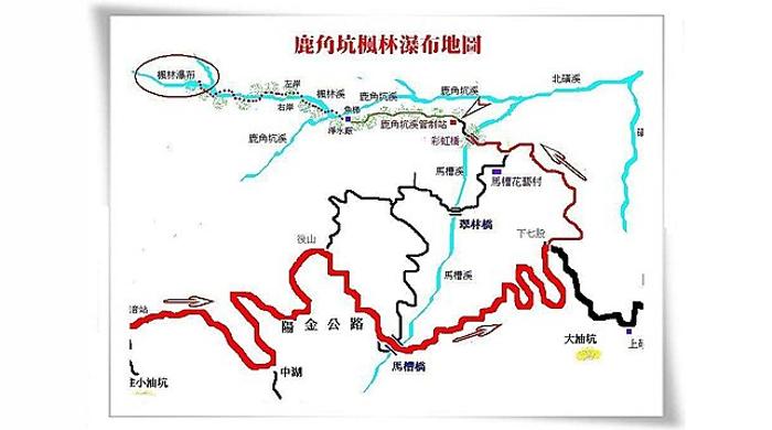 鹿角坑生態保護區管制站,H345M. .17分. .環保局基石、魚梯,H420M. .35分. .楓林瀑布,H621M. .47分. .鹿角坑生態保護區管制站,H345M