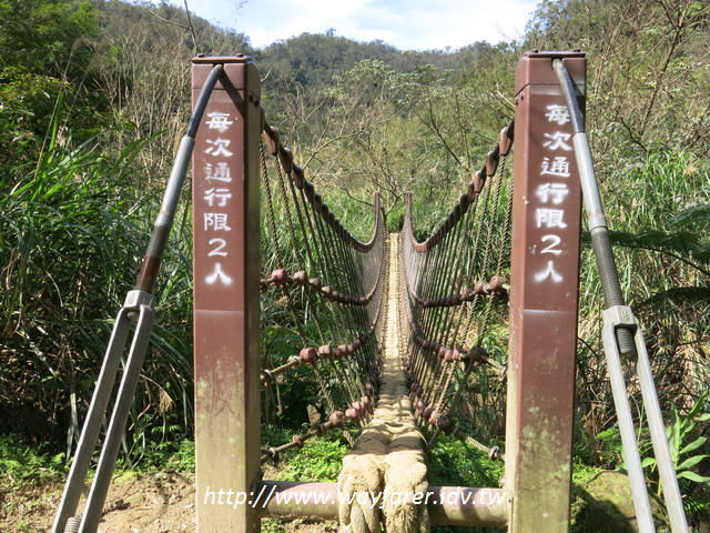 12:18 觀瀑點沒有路了,所以走往三貂嶺瀑布步道,右邊即是2號吊橋,照片10:15過橋之後就是這裡。這裡遇到一對情侶問我來處為何,回答之後,他們就決定過去看看合谷瀑布頂。這讓我擔心,因為他們看來像一般遊客,因此特別叮囑他們看完合谷瀑布頂不可再前行,他們也答應我會折返。