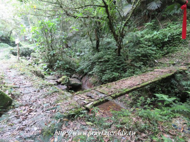 08:49 已有些腐爛但還算堅固的木橋。過橋左往番子坑16、17號民宅、鷹村橋,回程會走。取右續行。