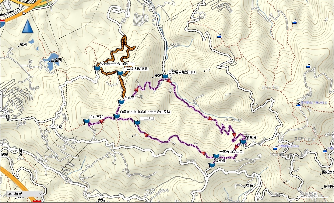 停車處,光明寺,h434m. .3分. .十三分山登山口,h451m. .38分. .十三分山,土地調查局圖根點,h442m. .10分. .白雲寺、文山茶莊、十三分山叉路,h369m. .10分. .文山茶莊,h319m. .10分. .白雲寺、文山茶莊、十三分山叉路,h369m. .8分. .白雲寺,h332m. .23分. .白雲居茶苑登山口,h149m. .66分. .觀景台,h477m. .13分. .停車處,光明寺,h434m
