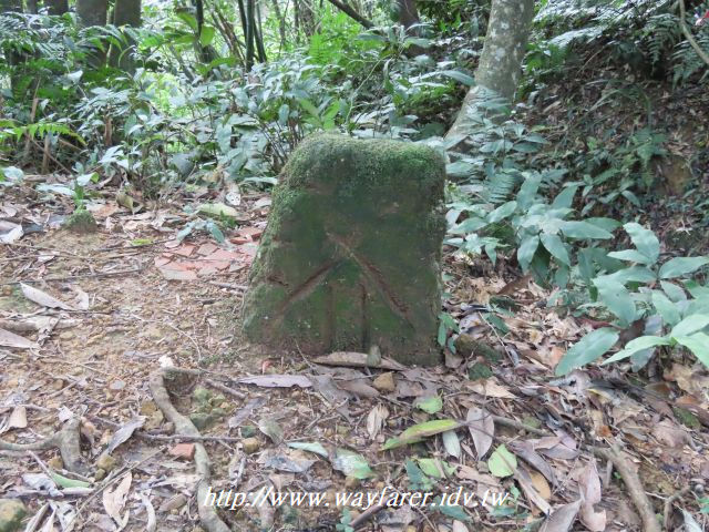 14:18 陡下2分鐘後。有個石碑,台北州-基隆郡,越嶺古道碑。石面上的字依稀可辨。