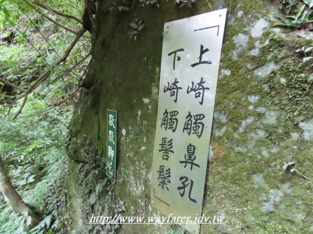 12:05 岩面標示的這諺語說明了錫隘古道在過去的難行。登山口有個錫隘隧道闢建記事有提到。以台語或客家話來唸,大概都能理解其意。