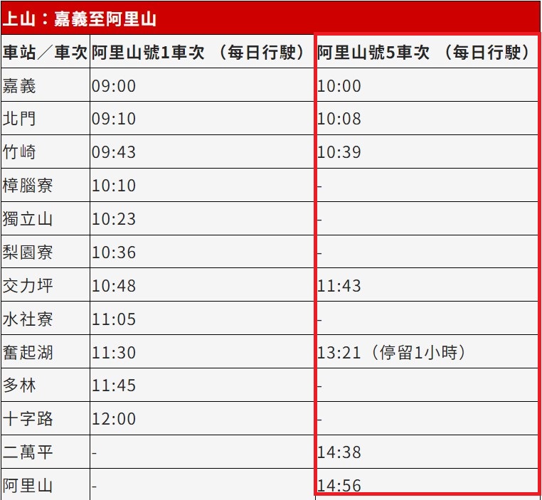 台灣好行:阿里山-高鐵嘉義站。票價278元。