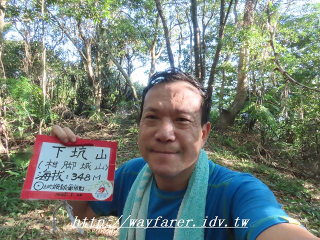 柑腳城山,又稱下坑山,海拔高度348公尺,土地調查局圖根點。