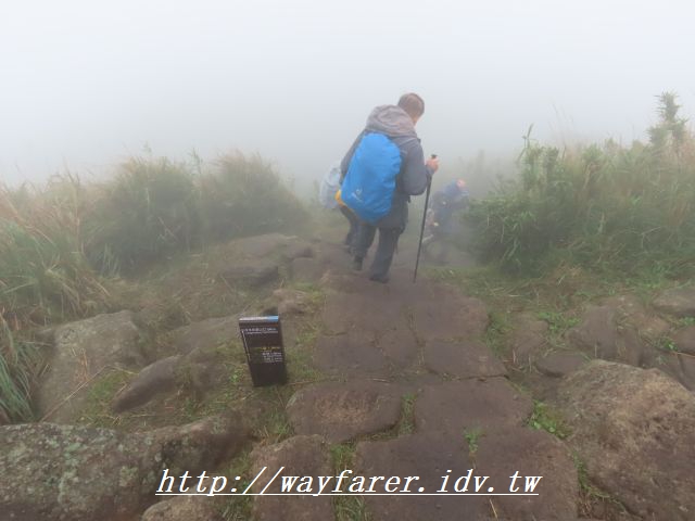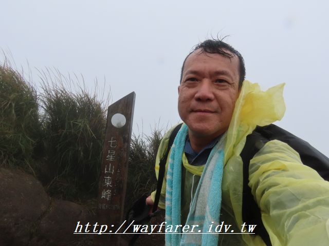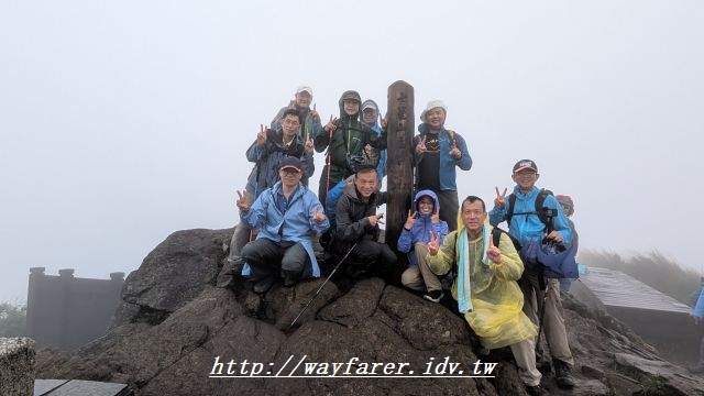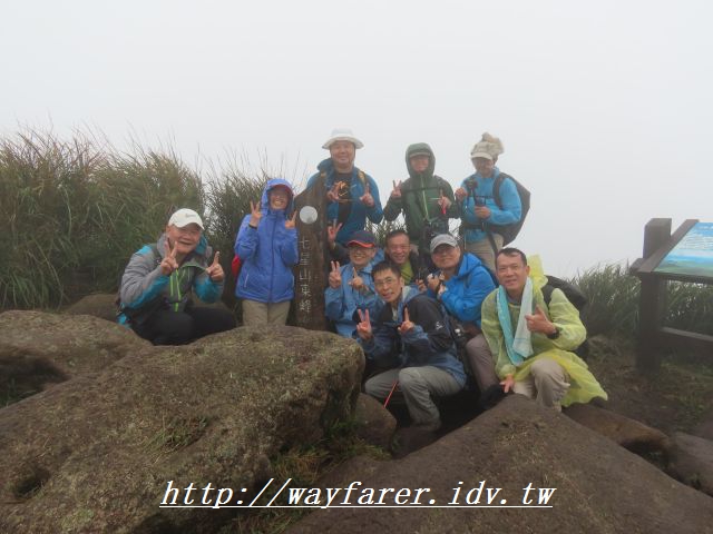 12:18 在我抵達七星山的25分鐘後,網紅Tony終於到了,淒風苦雨中,加上與標高柱拍照有一堆人等候,大家趕緊合照。
