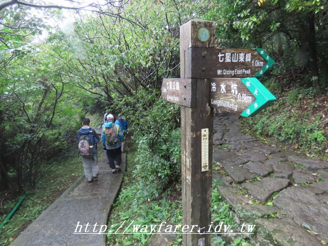 冷水坑遊客服務站,h740m. .3分. .冷苗步道叉路,h738m. .27分. .七星山、苗圃叉路,h805m. .2分. .七星山、七星公園叉路,h823m. .25分. .七星山主峰、東峰叉路,h1076m. .4分. .七星山主峰,一等三角點,小百岳編號2號,台北市第一高峰,h1108m. .4分. .七星山主峰、東峰叉路,h1076m. .4分. .七星山東峰,三等三角點1104號,h1097m. .24分. .七星公園、夢幻湖、七星山東峰叉路,h889m. .3分. .七星公園,h859m. .4分. .七星公園、夢幻湖、七星山東峰叉路,h889m. .1分. .國立教育廣播電臺,h890m. .1分. .冷水坑、夢幻湖叉路,h889m. .6分. .夢幻湖,h869m. .22分. .冷水坑遊客服務站,h740m