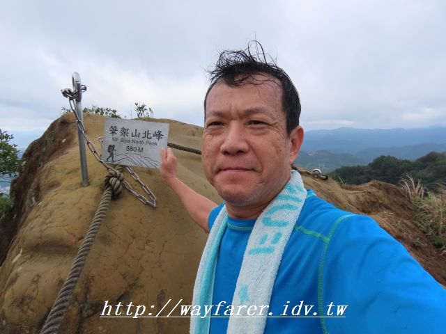 11:00 筆架山北峰(筆架山主峰),海拔高度580公尺,無基石。自拍合照。
