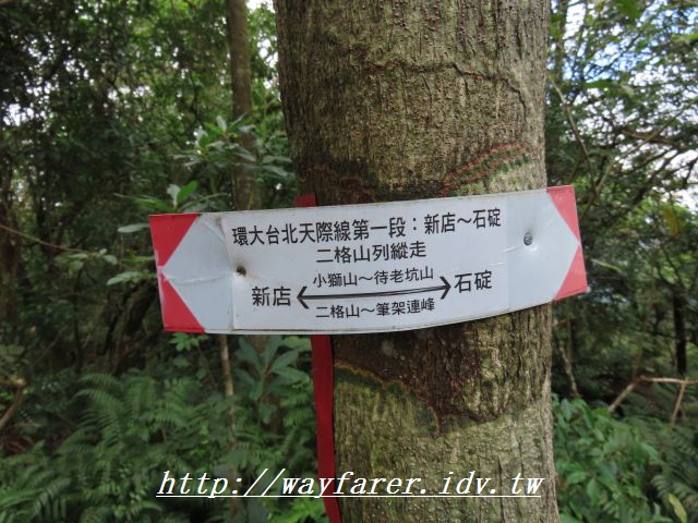 石碇分駐所,h98m. .2分. .石碇國小,h95m. .6分. .西帽子岩登山口,h100m. .14分. .民宅,h194m. .17分. .石碇國小、烏塗窟、西帽子岩叉路,h342m. .31分. .溪邊寮山、西帽子岩叉路,h465m. .7分. .西帽子岩,無基石,h470m. .7分. .山羊洞叉路,h485m. .10分. .炙子頭山,土地調查局圖根點,h514m. .24分. .昇高坑、筆架山叉路,h530m. .19分. .筆架山北峰,無基石,h557m. .2分. .筆架山南峰,無基石,h563m. .38分. .綠豆湯鞍部,h562m. .17分. .二格山,三等三角點701號,小百岳編號17,h658m. .26分. .南邦寮山,都市計劃處四等三角點102號,h574m. .13分. .福德宮,h514m. .6分. .土徑叉路,h529m. .13分. .貓空尖,無基石,h546m. .14分. .捷徑與正路叉路,正路路跡極差,h504m. .2分. .十六分山,都市計畫處四等三角點101號,h506m. .17分. .三玄宮山,市63號,h458m. .1分. .百歲亭,h453m. .1分. .貓空纜車、鵝角格山、銀河洞瀑布叉路,h442m. .13分. .鵝角格山,都市計劃處四等三角點104號,h460m. .10分. .鵝角格山、待老坑山、貓空纜車站叉路,h348m. .13分. .待老坑山、優人神鼓叉路,h338m. .5分. .待老坑山,三等三角點1095號,h373m. .6分. .優人神谷鼓山上劇場,h299m. .5分. .騰龍御櫻入口,h243m. .9分. .員潭子坑山,北市府地測26號,h239m. .11分. .大香山登山口,h214m. .6分. .大香山,無基石,h255m. .5分. .大香山登山口,h214m. .20分. .小獅山登山口,h140m. .10分. .小獅山,無基石,h201m. .8分. .文中路叉路,h161m. .8分. .文中路登山口,h61m. .7分. .捷運新店站,h23m