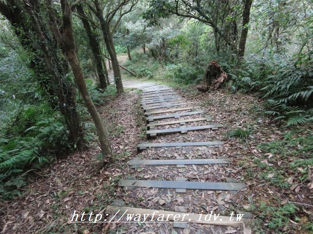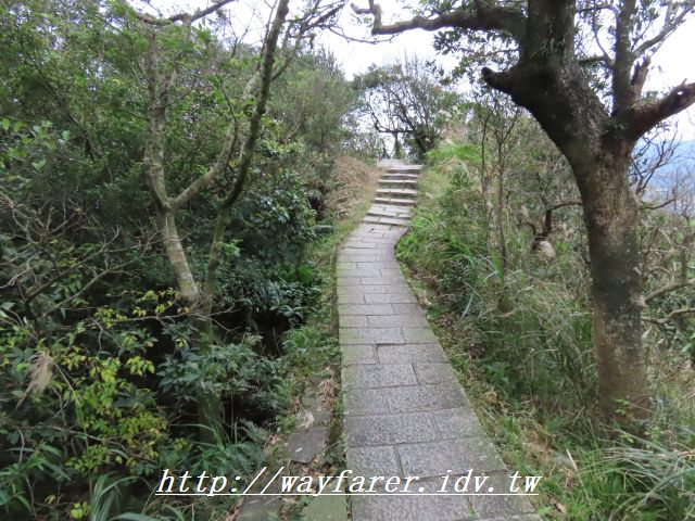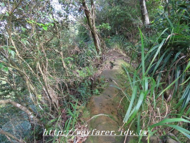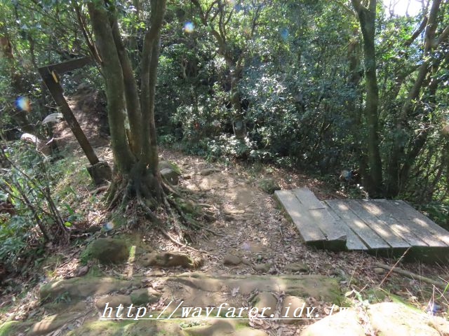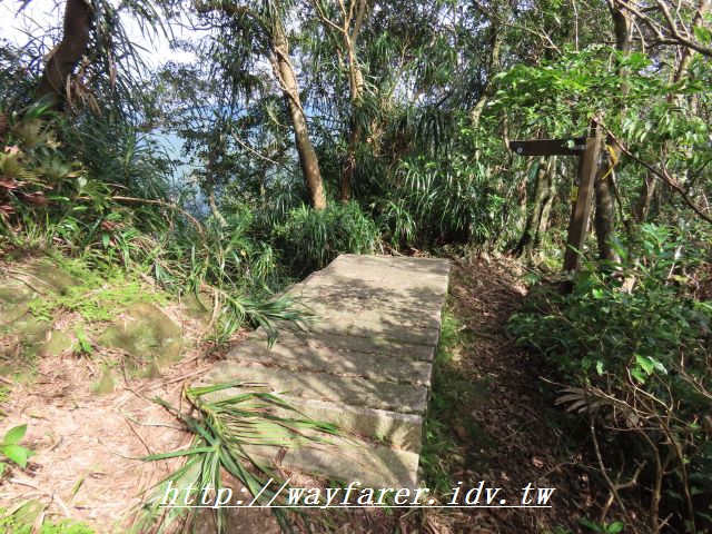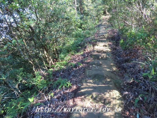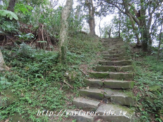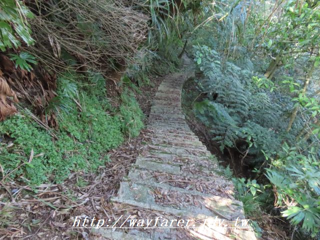 11:24 出現石階步道,表示要下山了。右前往鳥嘴尖,曾經走過;取左往永定村、大溪墘。