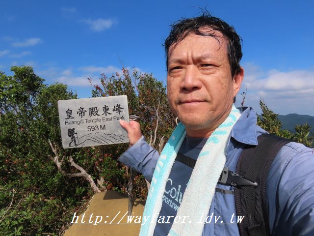 10:41 這處等山友照相比較久,4分鐘後才有機會自拍。皇帝殿東峰,海拔高度593公尺,無基石。拍完照又待了2分鐘小休。