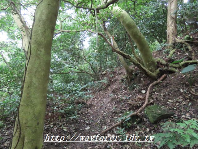 13:10 以為將是輕鬆路線了,沒想到還有這麼驚人的陡上崎嶇山徑,運氣不好的是竟然下起小雨,感覺不撐傘都不行,但還是決定撐看看,畢竟這種情況下要從背包拿雨傘不方便,撐了傘也 不好走。