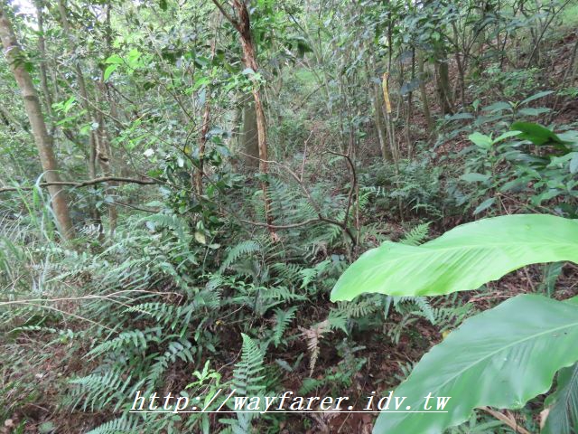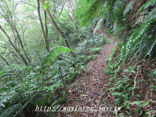 12:25 接下來是有上有下的落葉土徑,路跡也好些,算是不錯的自然山徑。可惜有蚊子和沿路的蜘蛛絲,走得很煩躁。這時則是要陡下坡。