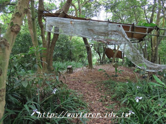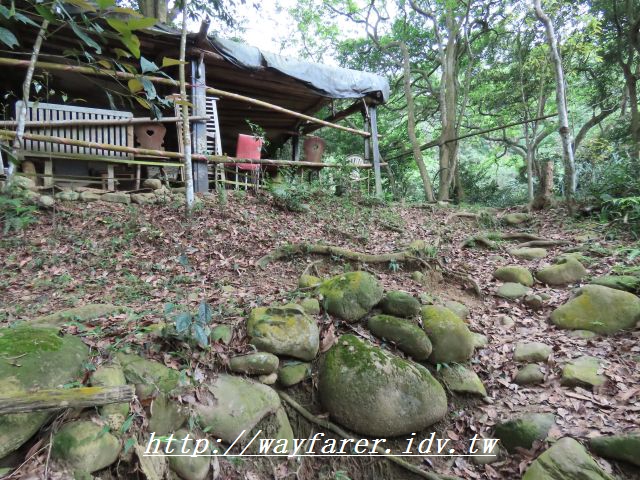 13:17 陡上到此,雨勢變小,不撐傘也沒關係,但也到了高點,右邊還有個休息棚子,正好來休息,續行路則是左邊。