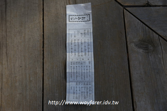 但因沒注意也不知騎到哪去,似乎也是另一處別墅區塊,還有上下坡,感覺越來越荒涼,才決定折返,再度慶幸是租電動腳踏車,不然上坡可就很費力了。之後來到諏訪神社,很有神社的寧靜感,此時並沒有任何人,就獨享這份寧靜。看到神社前綁了許多簽紙,簽紙箱標示投一百日圓自由取簽,心血來潮就投了一百拿了一張簽,因不懂如何進行拜拜取簽的步驟,也就省略,直接拿簽。這簽標示為小吉,至於內容就請大家自己看了。