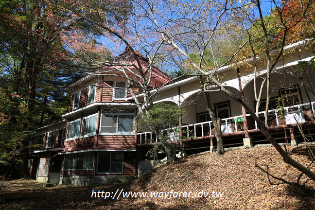 騎著騎著離開了別墅區,到了大柏油路,再看到自行車資訊標示10後,突然領悟了可以遵循,拿出地圖景點的標示,覺得遵循著騎乘也不錯,因此接下來便是標示號碼的累積騎乘。這一來終於不會像之前一樣亂騎,不知道想去的地方該怎麼騎。先在一處瑞士舊公使館(深山莊)停下來逛,看起來不確定是否還有住人,因為窗門緊閉,但四周卻整理得很乾淨,沒有荒廢感。逛完後便離開續往前騎到了舊三笠旅館。但進去參觀要門票400日圓,猶豫了一下,既來之則逛之,因為外觀看來還不錯。