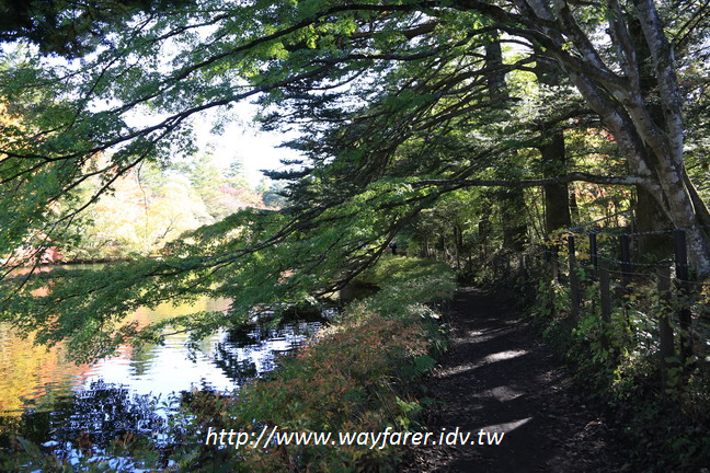 繼續循著指標騎,舊三笠旅館是這方向最後的景點,因此得往回騎,仍是森林步道,還騎到了之前逛過的瑞士舊公使館(深山莊)另一處入口,頗覺有趣。然後依序按照自行車資訊的14~18,在優美的森林區騎乘,然後到了著名景點"雲場池"。到了雲場池人潮完全不一樣,誇張的多,大概很多人只以這處為目的吧,連腳踏車都得調一下位置才能停。也就是在這裡才能看到比較大片的紅葉,總算到輕井澤來,不會完全沒有收獲。邊走邊逛邊照相,眼睛看的是美景,照起來也是美景。我從來不喜歡對相片後製或調什麼特別參數,因為那樣就不真了。因此在相片看到的風景,與實際身處其中所看的,應該差異不大。池子裡還有些鴨子,讓景色變得更活,鴨子們活得很悠哉。繞行一圈的過程中,幾乎每走幾步就有美景令人駐足欣賞與照相,雲場池讓大家不虛此行。