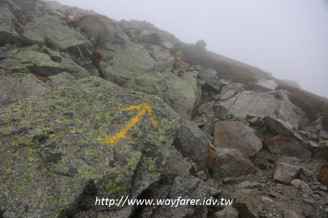 接下來走的便是陡上的亂石堆與碎石坡,對我來說不夠成行走困難,只是就沒很好的指標了。而天雨造成的霧濛濛視線不佳,只能靠著眼前幾公尺來找路。幸好雖無文字指標,每段路上總能看見石頭上上漆的箭頭來走。路雖崎嶇難行還不是我的難處,小雨也不太是,強風亂吹才是令我感到悽慘的地方,因為那讓我感到寒冷。原本不是太有影響的小雨,也在後來造成身體感覺更冷的因素。總之強風、冷雨,讓我的意志很薄弱。所幸至少要到達雄山的堅持,促使我無懼寒風痛苦,堅持下去。這一連串的陡上,其實只有兩段,但要上爬300公尺,在強風冷雨的情況下,就不輕鬆了。同時得隨時注意路面石頭上的箭頭找路,心情也很不安,一旦迷路就慘了。