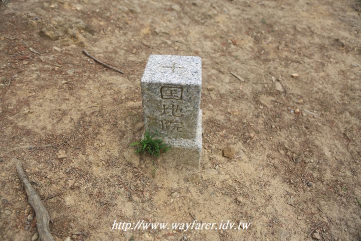 山下風景還不錯,登高望遠,視野遼闊,精神為之振奮。這時也看到了三等三角點的基石,高興地與之合照。我也看到了後到的日本人,到此便去摸基石,這是一個特別做的動作,不像我雖也會去碰基石,卻都無任何目的,很自然在與之照相或看它是什麼基石而碰的。原本利用地形地物來與基石合照,山友出聲願意幫我照相,那就太棒了,很高興。通常我是利用地形地物也沒法自拍合照時才會想找人幫忙,但有人願意伸援手那當然好。