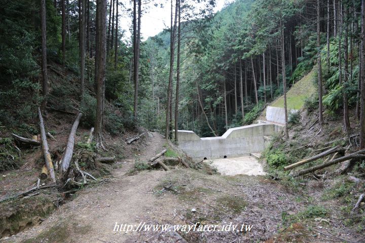 回到叉路繼續向前,沒多久再遇叉路,標示如意岳上稜與山腰路,心想可互通,故而選擇上稜路。這一段也是森林步道,多處可見砍伐樹木的痕跡。到了標示如意岳的地方,有圍欄擋住一建築,原來是大阪航空局的保安設施建物。不擔心,找了一下便發現續行之路,是一個先下後上的繞路,來到此建物的車道端。這時還是老神在在,爬山多了,接上柏油路也沒什麼,不過久了,再加上沿路注視有無再回到森林步道的小徑仍沒發現時,就有點擔心走錯了,當中還嘗試往回方向的叉路,但明顯不是,才又繼續向前。之後在航空建物出來的柏油路走約8分鐘的地方,有一缺口,但卻標示颱風之故步道崩塌不可通行。於是再繼續往前約4分鐘,在一個"火の用心"的標示處看到了另一缺口,這裡也有登山路條,因此即使沒看到標示往何處,也大膽向前,只是此時大概已經有感覺是走錯了,這路線不像是往比叡山的方向。