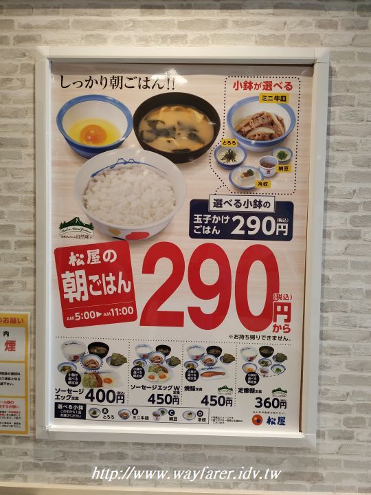 今天不需要早起了,但因很早睡,所以鬧鐘調7點起床,是這幾天最晚起床的。先整理好行李,才下去吃早餐。沒猜錯,旅館的早餐地點就是昨晚的晚餐地點松屋。此刻極度後悔,花了900日圓跟旅館買早餐,同樣的早餐450元就可以直接在松屋吃到了。