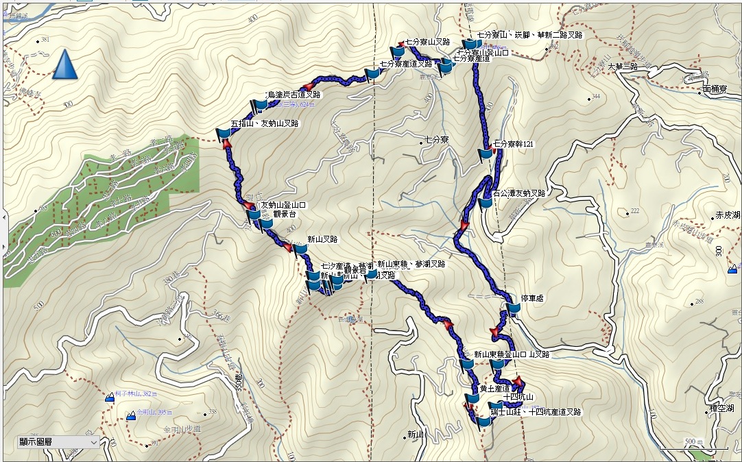 停車處,七分寮古道登山口,H158M. .22分. .十四坑山叉路,H293M. .23分. .十四坑山,土地調查局圖根點,H365M. .3分. .瑞士山莊、十四坑產道叉路,H357M. .9分. .黃土產道,H311M. .5分. .新山東稜登山口,H320M. .35分. .新山東稜、夢湖叉路,H413M. .12分. .觀景岩,H468M. .3分. .新山、夢湖叉路,H450M. .1分. .新山、友蚋山叉路,H444M. .10分. .新山,野牛2號基石,H505M. .8分. .七汐產道、夢湖、新山叉路,H474M. .14分. .新山叉路,H416M. .12分. .觀景台,H496M. .4分. .友蚋山登山口,H478M. .21分. .五指山、友蚋山叉路,H640M. .5分. .友蚋山,三等三角點787號,H641M. .1分. .烏塗炭古道叉路,H635M. .22分. .七分寮產道叉路,H554M. .5分. .七分寮山叉路,H509M. .13分. .七分寮產道,H470M. .1分. .七分寮山登山口,H464M. .3分. .七分寮山、崁腳、華新二路叉路,H466M. .1分. .七分寮山,礦務課基石第269號,H471M. .1分. .七分寮山、崁腳、華新二路叉路,H466M. .21分. .七分寮山登山口(七分寮幹121),H291M. .8分. .石公潭友蚋叉路,H263M. .17分. .停車處,七分寮古道登山口,H158M
